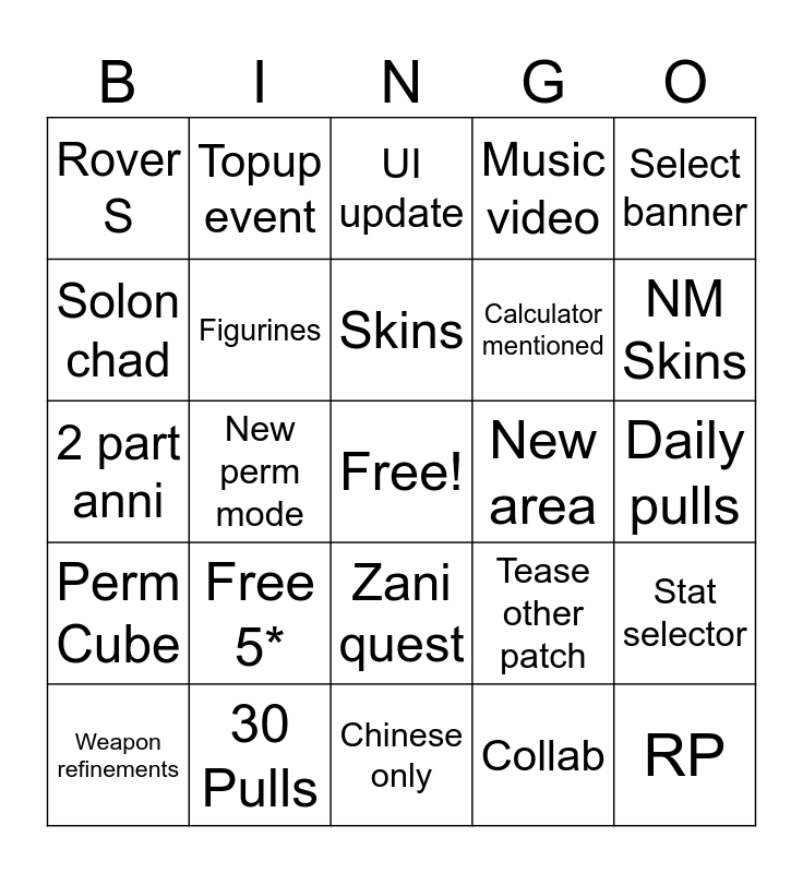 This bingo card has a free space and 24 words: Free 5*, 30 Pulls, Skins, Weapon refinements, Select banner, Rover S, Solon chad, Topup event, New area, Zani quest, Calculator mentioned, 2 part anni, Tease other patch, Stat selector, Figurines, Collab, Daily pulls, UI update, NM Skins, New perm mode, RP, Perm Cube, Music video and Chinese only.