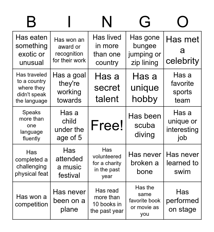 This bingo card has a free space and 24 words: Has attended a music festival, Has never been on a plane, Has a secret talent, Has won a competition, Has met a celebrity, Has eaten something exotic or unusual, Has traveled to a country where they didn't speak the language, Has won an award or recognition for their work, Has been scuba diving, Has volunteered for a charity in the past year, Has a unique hobby, Speaks more than one language fluently, Has never broken a bone, Has never learned to swim, Has a goal they're working towards, Has the same favorite book or movie as you, Has a unique or interesting job, Has lived in more than one country, Has a favorite sports team, Has a child under the age of 5, Has performed on stage, Has completed a challenging physical feat, Has gone bungee jumping or zip lining and Has read more than 10 books in the past year.
