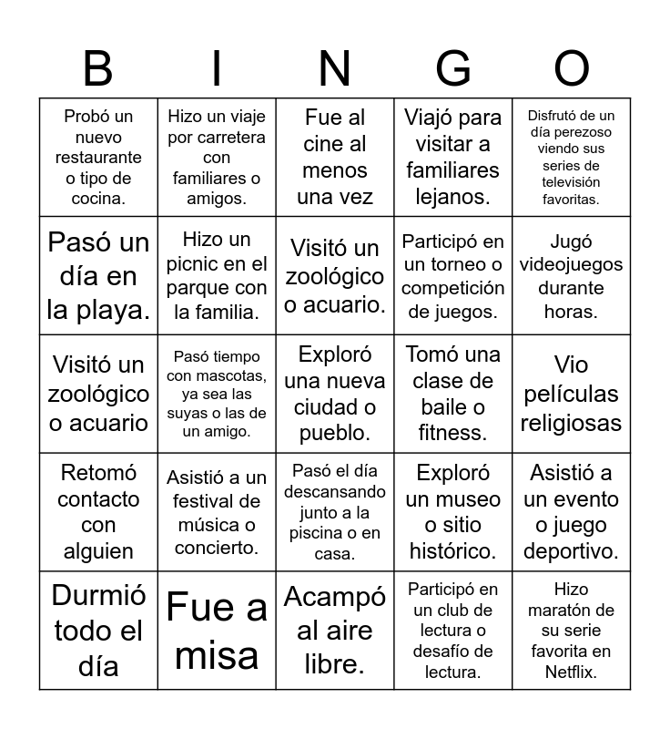 This bingo card has 50 words: Visitó un parque temático durante las vacaciones., Exploró una nueva ciudad o pueblo., Probó un deporte acuático nuevo, como el surf o el kayak., Acampó al aire libre., Asistió a un festival de música o concierto., Hizo trabajo voluntario en un proyecto de servicio comunitario., Hizo un viaje por carretera con familiares o amigos., Aprendió un nuevo pasatiempo, como pintar o la fotografía., Pasó un día en la playa., Hizo senderismo en un parque nacional o reserva natural., Hizo un picnic en el parque con la familia., Viajó para visitar a familiares lejanos., Asistió a un evento o juego deportivo., Exploró un museo o sitio histórico., Probó una nueva actividad aventurera, como tirolesa o escalada en roca., Participó en una clase de cocina o repostería., Visitó un zoológico o acuario., Tomó una clase de baile o fitness., Hizo una compras para el regreso a clases., Disfrutó de un día perezoso viendo sus series de televisión favoritas., Pasó tiempo con mascotas, ya sea las suyas o las de un amigo., Participó en un club de lectura o desafío de lectura., Probó un nuevo restaurante o tipo de cocina., Participó en un torneo o competición de juegos., Asistió a una reunión familiar o celebración especial., Hizo maratón de su serie favorita en Netflix., Jugó videojuegos durante horas., Leyó un libro o varios libros durante las vacaciones., Fue al cine al menos una vez, Pasó el día descansando junto a la piscina o en casa., Hizo un viaje por carretera con familiares o amigos., Salió del país, Probó una nueva comida, Hizo un deporte extremo, Fue a misa, Se varó en la carretera, Cocinó, Fue al gimnasio, Fue al estadio o a un evento deportivo, Vio películas religiosas, Pasó un día en la playa., Realizó alguna obra artística, Fue de compras, Pasó tiempo con mascotas, ya sea las suyas o las de un amigo, Durmió todo el día, Visitó un zoológico o acuario, Acampó al aire libre, Se cayó o se enfermó, Retomó contacto con alguien and Cambió de look.