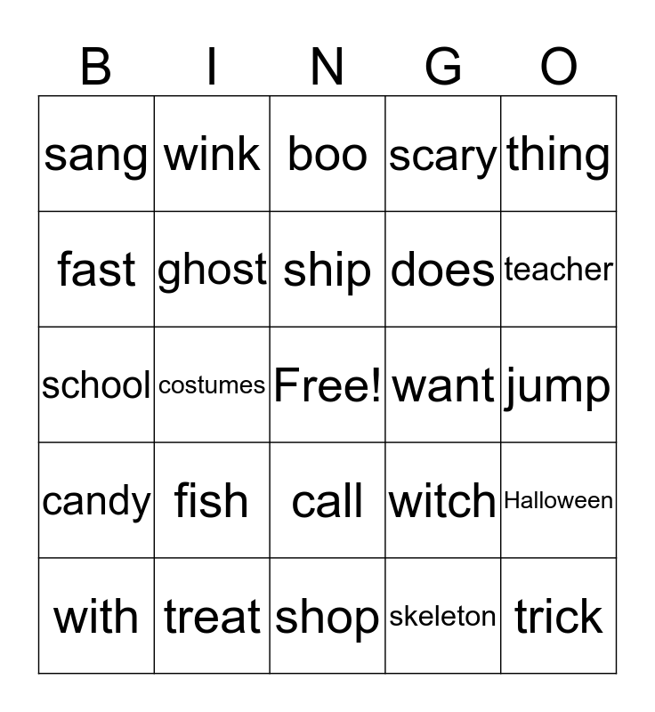This bingo card has a free space and 25 words: fish, shop, ship, with, thing, sang, fast, wink, want, call, does, school, witch, Halloween, ghost, bats, jump, boo, teacher, costumes, trick, treat, candy, scary and skeleton.