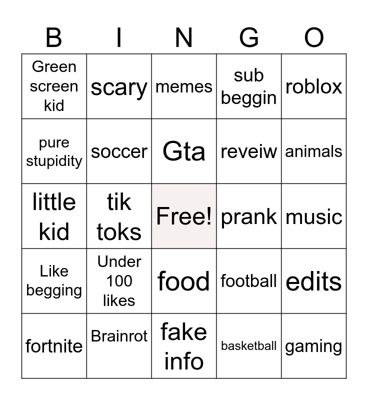 This bingo card has a free space and 24 words: Under 100 likes, Brainrot, Gta, fortnite, roblox, Green screen kid, pure stupidity, scary, prank, food, reveiw, little kid, football, edits, soccer, basketball, music, memes, animals, tik toks, gaming, Like begging, sub beggin and fake info.
