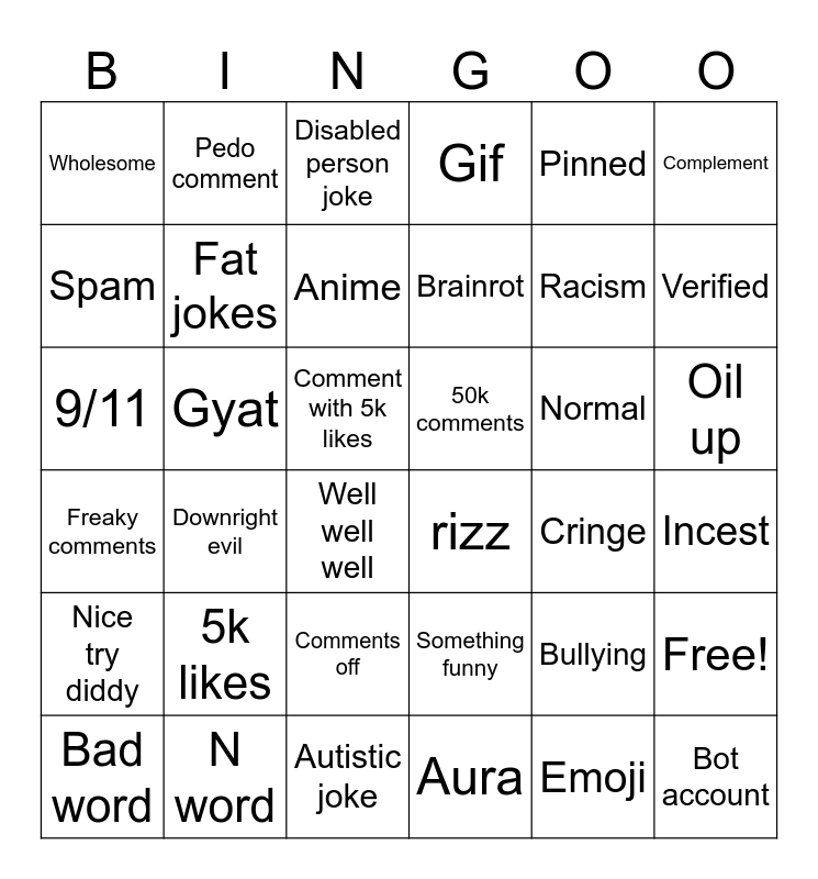 This bingo card has 36 words: Something funny, Comments off, Aura, Spam, Freaky comments, 50k comments, Fat jokes, Autistic joke, Pinned, Bullying, Verified, Gif, Free!, Gyat, Brainrot, Wholesome, Nice try diddy, Normal, 9/11, Disabled person joke, Comment with 5k likes, Downright evil, rizz, Well well well, Cringe, Pedo comment, Racism, N word, Anime, Complement, Bot account, Bad word, Incest, Oil up, 5k likes and Emoji.