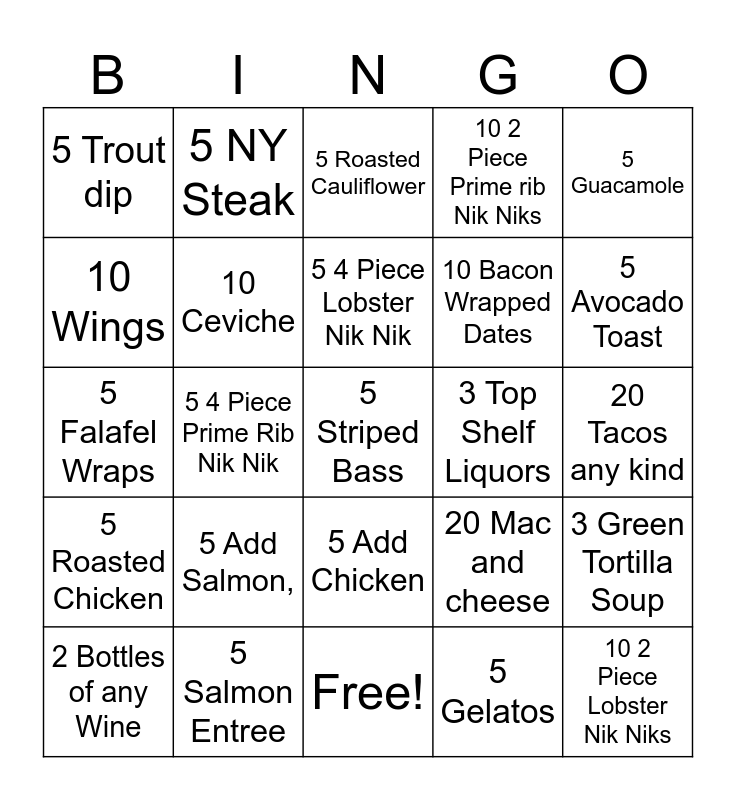 This bingo card has 25 words: 5 Roasted Chicken, 5 Salmon Entree, 5 Striped Bass, 5 Gelatos, 5 Guacamole, 5 Trout dip, 5 NY Steak, 5 Roasted Cauliflower, 3 Top Shelf Liquors, 3 Green Tortilla Soup, 10 Wings, 10 Ceviche, Free!, 20 Mac and cheese, 5 Avocado Toast, 2 Bottles of any Wine, 5 4 Piece Prime Rib Nik Nik, 5 4 Piece Lobster Nik Nik, 10 Bacon Wrapped Dates, 20 Tacos any kind, 5 Falafel Wraps, 5 Add Salmon,, 5 Add Chicken, 10 2 Piece Prime rib Nik Niks and 10 2 Piece Lobster Nik Niks.