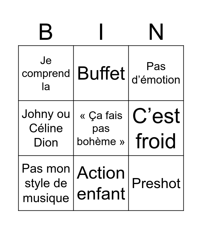 This bingo card has a free space and 8 words: C’est froid, Pas d’émotion, Buffet, Pas mon style de musique, Je comprend la, Preshot, Johny ou Céline Dion and Action enfant.