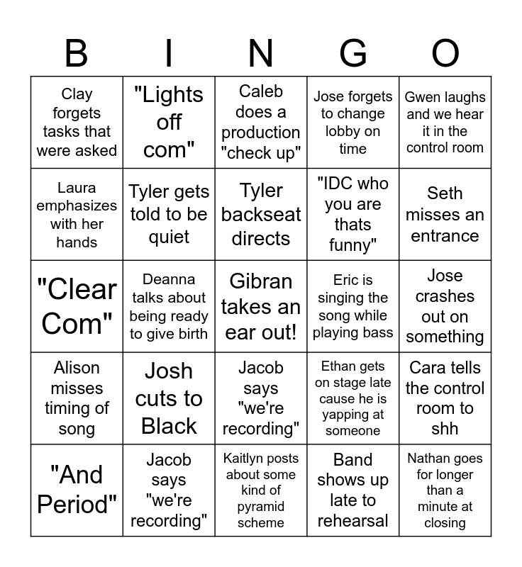 This bingo card has a free space and 24 words: Josh cuts to Black, Jacob says "we're recording", Tyler backseat directs, "And Period", Gwen laughs and we hear it in the control room, Clay forgets tasks that were asked, Laura emphasizes with her hands, "Lights off com", Eric is singing the song while playing bass, Jacob says "we're recording", "IDC who you are thats funny", "Clear Com", Ethan gets on stage late cause he is yapping at someone, Cara tells the control room to shh, Tyler gets told to be quiet, Band shows up late to rehearsal, Jose crashes out on something, Caleb does a production "check up", Seth misses an entrance, Deanna talks about being ready to give birth, Nathan goes for longer than a minute at closing, Alison misses timing of song, Jose forgets to change lobby on time and Kaitlyn posts about some kind of pyramid scheme.