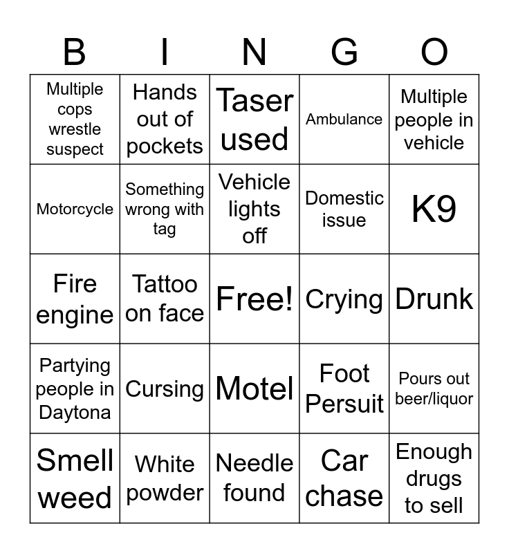 This bingo card has a free space and 29 words: Smell weed, Child in car, Tattoo on face, Pills, Multiple cops wrestle suspect, Taser used, Something wrong with tag, Cursing, Crying, White powder, Drunk, Enough drugs to sell, Needle found, Car chase, K9, Walmart/ Dollar General/$ Store, Motel, Partying people in Daytona, Multiple people in vehicle, Fire engine, Foot Persuit, Open container, Domestic issue, Motorcycle, Ambulance, Hands out of pockets, Pours out beer/liquor, Vehicle lights off and Stop sticks deployed.