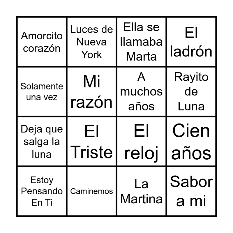 This bingo card has 48 words: Perfume de Gardenias, Estoy Pensando En Ti, Amor de Cabaret, El Mudo, Congoja, La Boa, Luces de Nueva York, Dónde Estás Yolanda, Mi razón, Noche Inolvidable, A muchos años, El ladrón, Bomboro Quiña Quiña, Musita, Contigo, Sin Ti, Rayito de Luna, Caminemos, Un Siglo de Ausencia, Solamente una vez, Cien años, Historia de un amor, Amorcito corazón, Deja que salga la luna, Payaso, El Triste, Sombras, La Malagueña, No volveré, Sabor a mi, En mi viejo San Juan, El Rey, México lindo y querido, Ay Jalisco no te rajes, Amor de mis amores, Maria Bonita, Quizás, Quizás, Quizás, La Martina, Violencia, Si te vas, El pipiribao, Mi corazon es delicado, Ella se llamaba Marta, Penas, El reloj, Costumbres, Amor de Estudiante and Chiquitita.