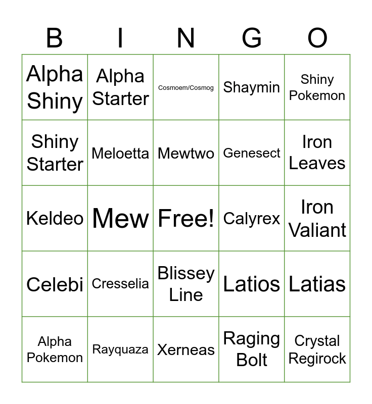 This bingo card has a free space and 24 words: Cresselia, Rayquaza, Mewtwo, Alpha Pokemon, Shiny Pokemon, Alpha Shiny, Shiny Starter, Alpha Starter, Calyrex, Blissey Line, Genesect, Keldeo, Latios, Latias, Meloetta, Raging Bolt, Iron Valiant, Cosmoem/Cosmog, Iron Leaves, Mew, Crystal Regirock, Celebi, Shaymin and Xerneas.