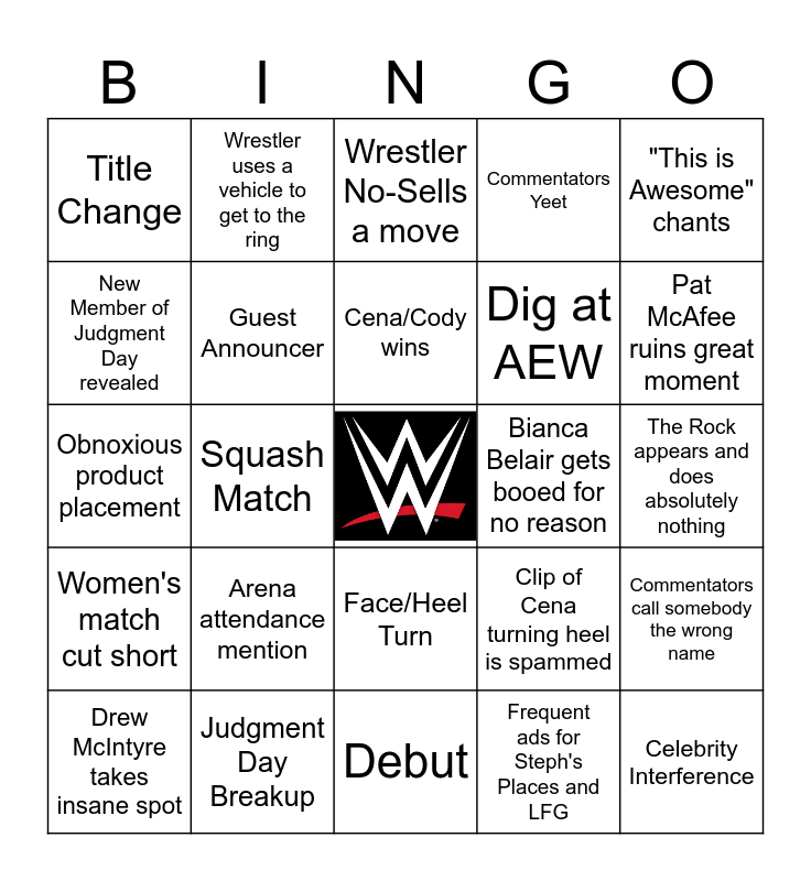 This bingo card has a free space and 30 words: Judgment Day Breakup, Right Wing Figure Shown, Squash Match, Special Entrance, Title Change, Wrestler No-Sells a move, Guest Announcer, Face/Heel Turn, Bianca Belair gets booed for no reason, Debut, The Rock appears and does absolutely nothing, Celebrity Interference, Frequent ads for Steph's Places and LFG, 5+ mentions of Triple H being a Hall of Famer, Pat McAfee ruins great moment, Surprise Legend appearance (not including The Rock), Clip of Cena turning heel is spammed, Women's match cut short, Arena attendance mention, "This is Awesome" chants, Obnoxious product placement, Blood, Wrestler uses a vehicle to get to the ring, Dig at AEW, New Member of Judgment Day revealed, Commentators Yeet, Commentators call somebody the wrong name, Drew McIntyre takes insane spot, Cena/Cody wins and Raquel Rodriguez botches.