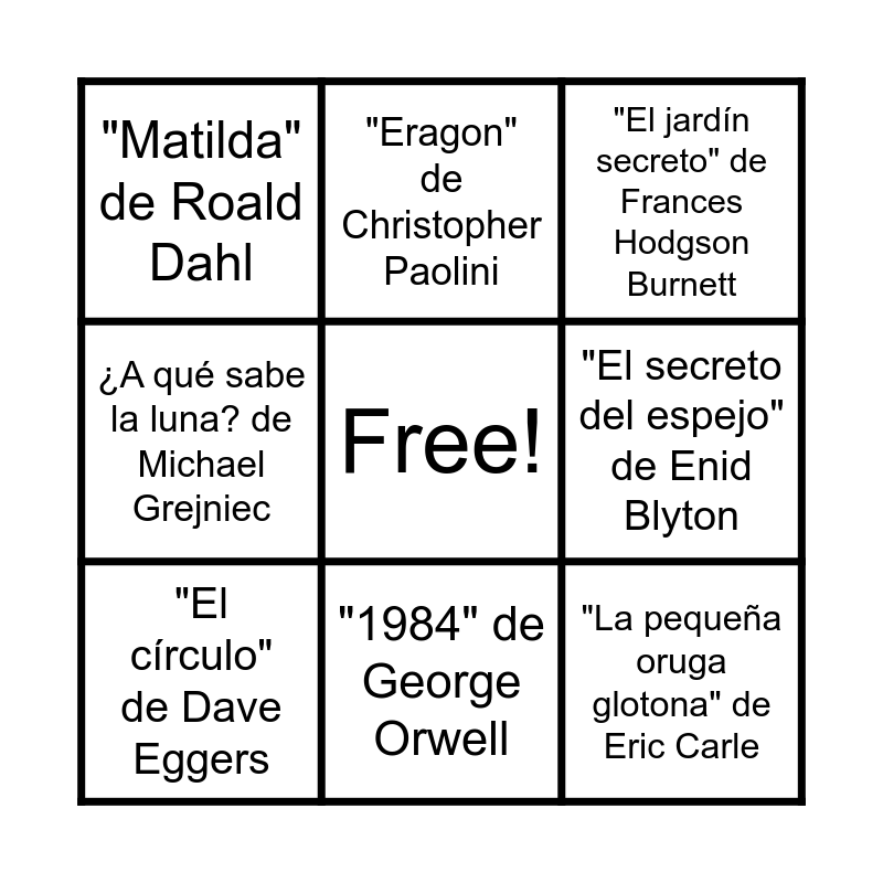 This bingo card has a free space and 70 words: "Elmer" de David McKee, "La oruga muy hambrienta" de Eric Carle, "El monstruo de colores" de Anna Llenas, "El lobo que quería cambiar de color" de Orianne Lallemand, "Pío Peep" de Mary Murphybrillantes, "El pato y la luna" de James Thurber, ¿A qué sabe la luna? de Michael Grejniec, "La vaca que puso un huevo" de AndyUn, "La pequeña oruga glotona" de Eric Carle, "Elmer y el cumpleaños de la cebra" de David McKee, "Harry Potter y la piedra filosofal" de J. K. Rowling, "Percy Jackson y los dioses del Olimpo: El ladrón del rayo" de Rick Riordan, "Matilda" de Roald Dahl, "El jardín secreto" de Frances Hodgson Burnett, "La telaraña de Carlota" de EB White, "Charlie y la fábrica de chocolate" de Roald Dahl, "Los cinco y el tesoro de la isla" de Enid Blyton, "La invención de Hugo Cabret" de Brian Selznick, "Wonder" de RJ Palacio, "El viento en los sauces" de Kenneth Grahame, "La brújula dorada" de Philip Pullman, "Un puente hacia Terabithia" de Katherine Paterson, "El secreto del espejo" de Enid Blyton, "Las crónicas de Narnia: El león, la bruja y el armario" de CS Lewis, "El castillo de Hohenburg" de EMH Sellar, "El último unicornio" de Peter S. Beagle, "El pequeño Nicolás" de René Goscinny, "Una serie de catastróficas desdichas" de Lemony Snicket, "El príncipe de la niebla" de Carlos Ruiz Zafón, "Cazadores de sombras: Ciudad de hueso" de Cassandra Clare, "Eragon" de Christopher Paolini, "La materia oscura: La brújula dorada" de Philip Pullman, "La guerra de los mundos" de HG Wells, "Alicia en el País de las Maravillas" de Lewis Carroll, "El mago de Oz" de L. Frank Baum, "Los juegos del hambre" de Suzanne Collins, "Sherlock Holmes: Estudio en escarlata" de Arthur Conan Doyle, "El nombre del viento" de Patrick Rothfuss, "La sombra del viento" de Carlos Ruiz Zafón, "El secreto del espejo" de Enid Blyton, "Una serie de catastróficas desdichas" de Lemony Snicket, "La casa de los espíritus" de Isabel Allende, "El código Da Vinci" de Dan Brown, "Asesinato en el Orient Express" de Agatha Christie, "Los hombres que no amaban a las mujeres" de Stieg Larsson, "El círculo" de Dave Eggers, "Bajo la misma estrella" de John Green, "Ciudades de papel" de John Green, "Cometas en el cielo" de Khaled Hosseini, "El retrato de Dorian Gray" de Oscar Wilde, "La ladrona de libros" de Markus Zusa, "El alquimista" de Paulo Coelho, "La chica del tren" de Paula Hawkins, "Don Quijote de la Mancha" de Miguel de Cervantes, "Orgullo y prejuicio" de Jane Austende, "Matar a un ruiseñor" de Harperde, "1984" de George Orwell, "Crimen y castigo" de Fiódor Dostoievskide, "Cien años de soledad" de Gabriel García Márquez, "La Odisea" de Homero, "Ulises" de James Joyce, "Los miserables" de Víctor Hugo, "El gran Gatsby" de F. Scott Fitzgerald, "En busca del tiempo perdido" de Marcel Proust, "La divina comedia" de Dante Alighieri, "Drácula" de Bram Stoker, "Frankenstein" de Mary Shelley, "Fahrenheit 451" de Ray Bradbury, "La metamorfosis" de Franz Kafka and "El Cantar de mio Cid" (Anónimo).