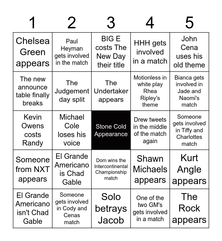 This bingo card has a free space and 24 words: El Grande Americano is Chad Gable, Someone gets involved in Cody and Cenas match, The Undertaker appears, El Grande Americano isn't Chad Gable, John Cena uses his old theme, Chelsea Green appears, The new announce table finally breaks, Paul Heyman gets involved in the match, Drew tweets in the middle of the match again, Dom wins the Intercontinental Championship match, Motionless in white play Rhea Ripley's theme, Kevin Owens costs Randy, Shawn Michaels appears, Kurt Angle appears, The Judgement day split, One of the two GM's gets involved in a match, Someone gets involved in Tiffy and Charlottes match, BIG E costs The New Day their title, Bianca gets involved in Jade and Naomi's match, Michael Cole loses his voice, The Rock appears, Someone from NXT appears, HHH gets involved in a match and Solo betrays Jacob.