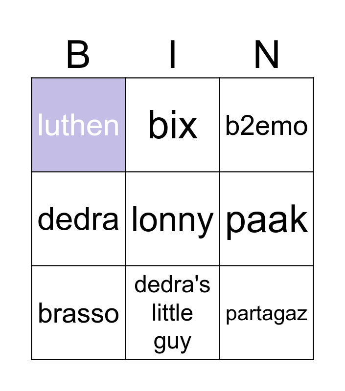 This bingo card has 9 words: brasso, b2emo, bix, dedra, luthen, paak, lonny, partagaz and dedra's little guy.