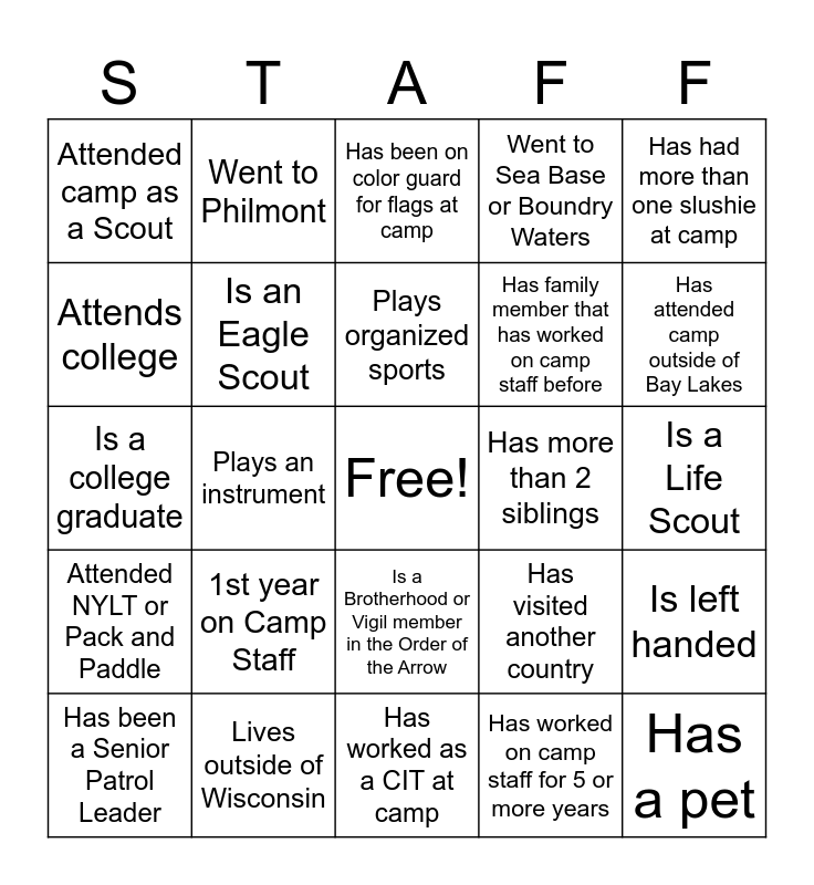This bingo card has a free space and 24 words: 1st year on Camp Staff, Lives outside of Wisconsin, Plays organized sports, Has been a Senior Patrol Leader, Has had more than one slushie at camp, Attended camp as a Scout, Attends college, Went to Philmont, Has more than 2 siblings, Is a Brotherhood or Vigil member in the Order of the Arrow, Has family member that has worked on camp staff before, Is a college graduate, Has visited another country, Is left handed, Is an Eagle Scout, Has worked on camp staff for 5 or more years, Is a Life Scout, Has been on color guard for flags at camp, Has attended camp outside of Bay Lakes, Plays an instrument, Has a pet, Attended NYLT or Pack and Paddle, Went to Sea Base or Boundry Waters and Has worked as a CIT at camp.
