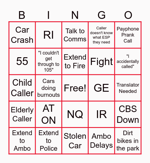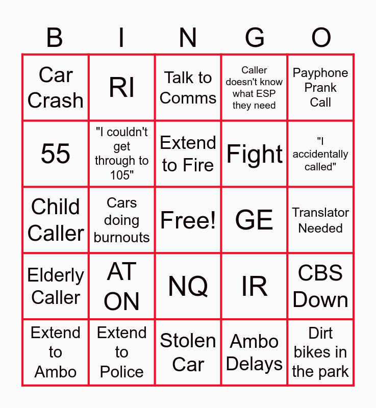 This bingo card has a free space and 24 words: AT ON, Extend to Police, Extend to Fire, Extend to Ambo, Payphone Prank Call, Car Crash, 55, RI, GE, NQ, Fight, Child Caller, IR, CBS Down, "I couldn't get through to 105", Ambo Delays, Translator Needed, Talk to Comms, "I accidentally called", Cars doing burnouts, Dirt bikes in the park, Elderly Caller, Caller doesn't know what ESP they need and Stolen Car.