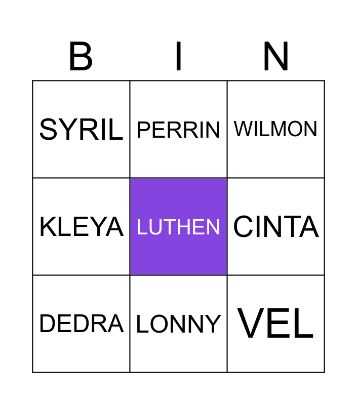 This bingo card has a free space and 8 words: KLEYA, PERRIN, CINTA, DEDRA, WILMON, SYRIL, LONNY and VEL.