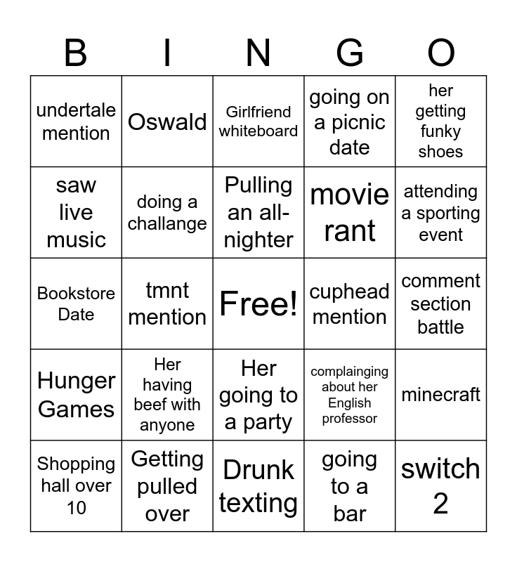 This bingo card has a free space and 31 words: Drunk texting, sonic mention, tmnt mention, spiderman mention, undertale mention, Girlfriend whiteboard, doing a challange, complainging about her English professor, cuphead mention, going to a bar, comment section battle, switch 2, mariokart, her book, attending a sporting event, Disney, minecraft, Her having beef with anyone, Hunger Games, Her going to a party, her getting funky shoes, Shopping hall under 5 items, Shopping hall over 10, Oswald, movie rant, saw live music, going on a picnic date, Bookstore Date, Getting pulled over, Pulling an all-nighter and Weed.