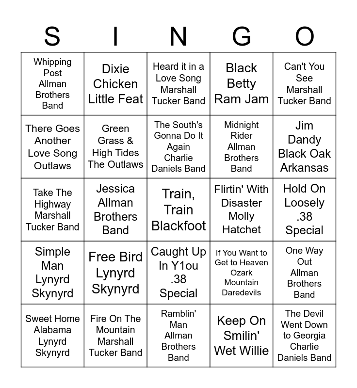 This bingo card has 25 words: Free Bird Lynyrd Skynyrd, Ramblin' Man Allman Brothers Band, The South's Gonna Do It Again Charlie Daniels Band, Sweet Home Alabama Lynyrd Skynyrd, Can't You See Marshall Tucker Band, Whipping Post Allman Brothers Band, There Goes Another Love Song Outlaws, Dixie Chicken Little Feat, Flirtin' With Disaster Molly Hatchet, Caught Up In Y1ou .38 Special, Midnight Rider Allman Brothers Band, Take The Highway Marshall Tucker Band, If You Want to Get to Heaven Ozark Mountain Daredevils, One Way Out Allman Brothers Band, Green Grass & High Tides The Outlaws, The Devil Went Down to Georgia Charlie Daniels Band, Hold On Loosely .38 Special, Heard it in a Love Song Marshall Tucker Band, Jim Dandy Black Oak Arkansas, Jessica Allman Brothers Band, Train, Train Blackfoot, Fire On The Mountain Marshall Tucker Band, Simple Man Lynyrd Skynyrd, Black Betty Ram Jam and Keep On Smilin' Wet Willie.