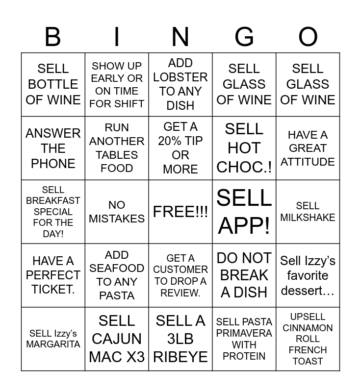 This bingo card has a free space and 24 words: ADD SEAFOOD TO ANY PASTA, SELL CAJUN MAC X3, GET A 20% TIP OR MORE, SELL Izzy’s MARGARITA, SELL GLASS OF WINE, SELL BOTTLE OF WINE, ANSWER THE PHONE, SHOW UP EARLY OR ON TIME FOR SHIFT, SELL APP!, GET A CUSTOMER TO DROP A REVIEW., SELL HOT CHOC.!, SELL BREAKFAST SPECIAL FOR THE DAY!, DO NOT BREAK A DISH, Sell Izzy’s favorite dessert…, RUN ANOTHER TABLES FOOD, SELL PASTA PRIMAVERA WITH PROTEIN, SELL MILKSHAKE, ADD LOBSTER TO ANY DISH, HAVE A GREAT ATTITUDE, NO MISTAKES, UPSELL CINNAMON ROLL FRENCH TOAST, HAVE A PERFECT TICKET., SELL GLASS OF WINE and SELL A 3LB RIBEYE.