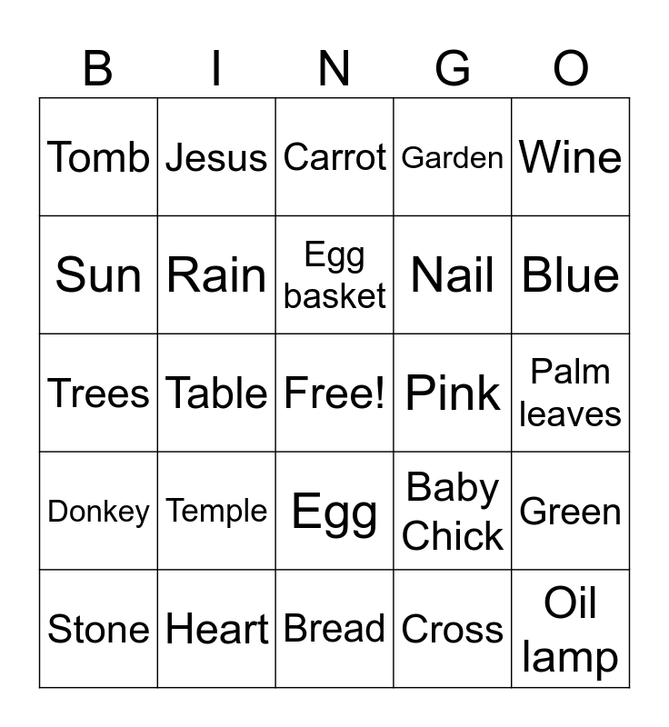 This bingo card has a free space and 39 words: Butterfly, Angel, Wash Basin, Rain, Stone, Egg, Egg basket, Rainbow, Wine, Donkey, Table, Garden, Oil lamp, Palm leaves, Pink, Temple, Yellow, Tomb, Chicken, Baby Chick, Sun, Bread, Nail, Blue, Lamb, Jelly Bean, Clouds, Bunny, Rabbit, Jesus, Grass, Crown of Thorns, Carrot, Heart, Cross, Purple, Green, Trees and Flowers.