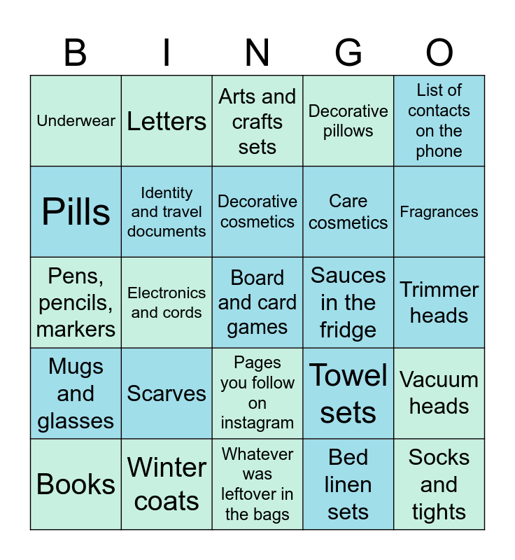 This bingo card has 25 words: Scarves, Whatever was leftover in the bags, Decorative cosmetics, Books, List of contacts on the phone, Underwear, Pills, Letters, Sauces in the fridge, Pages you follow on instagram, Care cosmetics, Pens, pencils, markers, Towel sets, Vacuum heads, Identity and travel documents, Socks and tights, Trimmer heads, Arts and crafts sets, Fragrances, Electronics and cords, Board and card games, Winter coats, Mugs and glasses, Decorative pillows and Bed linen sets.