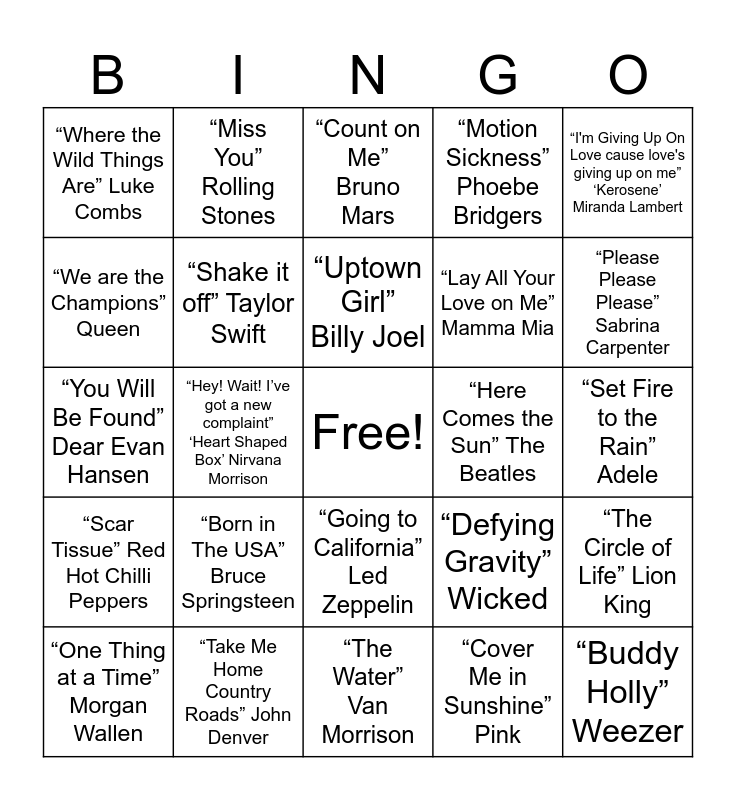 This bingo card has a free space and 24 words: “Born in The USA” Bruce Springsteen, “Take Me Home Country Roads” John Denver, “Uptown Girl” Billy Joel, “One Thing at a Time” Morgan Wallen, “I'm Giving Up On Love cause love's giving up on me” ‘Kerosene’ Miranda Lambert, “Where the Wild Things Are” Luke Combs, “We are the Champions” Queen, “Miss You” Rolling Stones, “Here Comes the Sun” The Beatles, “Going to California” Led Zeppelin, “Lay All Your Love on Me” Mamma Mia, “You Will Be Found” Dear Evan Hansen, “Defying Gravity” Wicked, “The Circle of Life” Lion King, “Shake it off” Taylor Swift, “Cover Me in Sunshine” Pink, “Set Fire to the Rain” Adele, “Count on Me” Bruno Mars, “Please Please Please” Sabrina Carpenter, “Hey! Wait! I’ve got a new complaint” ‘Heart Shaped Box’ Nirvana Morrison, “Buddy Holly” Weezer, “Scar Tissue” Red Hot Chilli Peppers, “Motion Sickness” Phoebe Bridgers and “The Water” Van Morrison.