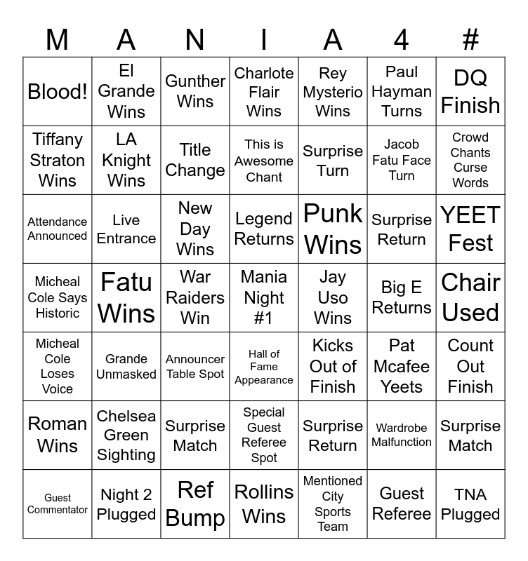 This bingo card has a free space and 48 words: Surprise Return, Jacob Fatu Face Turn, Rollins Wins, Fatu Wins, New Day Wins, Chair Used, El Grande Wins, Night 2 Plugged, Paul Hayman Turns, Hall of Fame Appearance, DQ Finish, Charlote Flair Wins, Surprise Return, Punk Wins, Roman Wins, Big E Returns, Tiffany Straton Wins, Crowd Chants Curse Words, Wardrobe Malfunction, Rey Mysterio Wins, Surprise Turn, War Raiders Win, Blood!, LA Knight Wins, Surprise Match, Title Change, YEET Fest, Guest Commentator, Legend Returns, Live Entrance, Guest Referee, Jay Uso Wins, Count Out Finish, Chelsea Green Sighting, Micheal Cole Says Historic, Kicks Out of Finish, Pat Mcafee Yeets, Attendance Announced, Announcer Table Spot, Surprise Match, Micheal Cole Loses Voice, TNA Plugged, Gunther Wins, Ref Bump, This is Awesome Chant, Special Guest Referee Spot, Grande Unmasked and Mentioned City Sports Team.