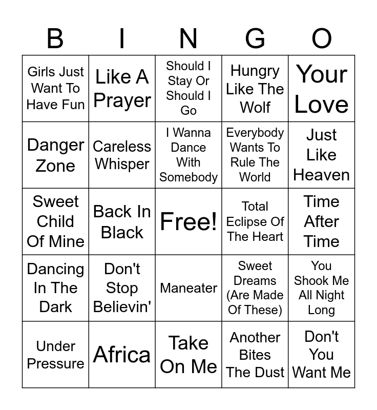 This bingo card has a free space and 24 words: Don't Stop Believin', Africa, I Wanna Dance With Somebody, Under Pressure, Your Love, Girls Just Want To Have Fun, Danger Zone, Like A Prayer, Total Eclipse Of The Heart, Maneater, Everybody Wants To Rule The World, Sweet Child Of Mine, Sweet Dreams (Are Made Of These), You Shook Me All Night Long, Careless Whisper, Another Bites The Dust, Time After Time, Should I Stay Or Should I Go, Just Like Heaven, Back In Black, Don't You Want Me, Dancing In The Dark, Hungry Like The Wolf and Take On Me.