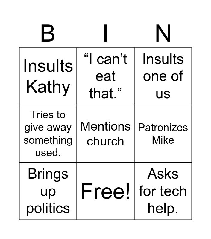 This bingo card has 10 words: Free!, Insults one of us, Insults Kathy, Mentions church, Tries to give away something used., Brings up politics, “I can’t eat that.”, “I don’t drink.”, Patronizes Mike and Asks for tech help..
