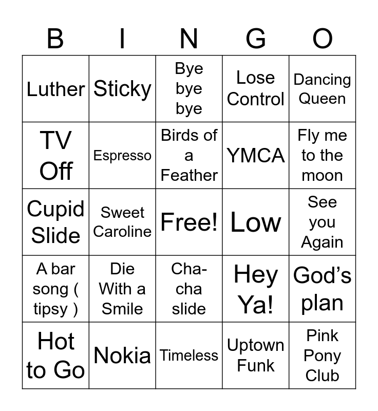 This bingo card has a free space and 24 words: Die With a Smile, Nokia, Birds of a Feather, Hot to Go, Dancing Queen, Luther, TV Off, Sticky, Low, Cha-cha slide, YMCA, Cupid Slide, Hey Ya!, God’s plan, Espresso, Uptown Funk, See you Again, Bye bye bye, Fly me to the moon, Sweet Caroline, Pink Pony Club, A bar song ( tipsy ), Lose Control and Timeless.