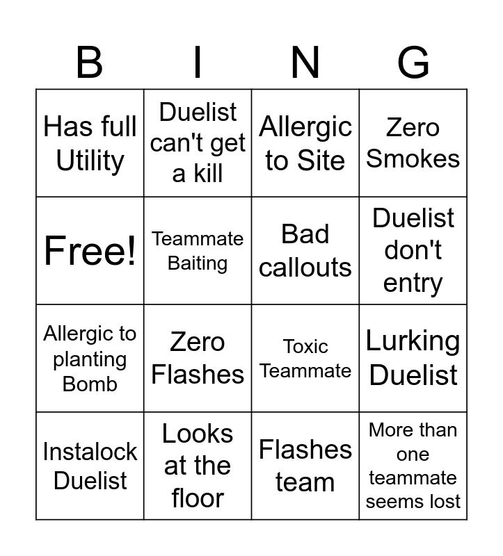 This bingo card has 16 words: Looks at the floor, Lurking Duelist, Allergic to Site, Has full Utility, Allergic to planting Bomb, Duelist can't get a kill, Toxic Teammate, Flashes team, Free!, Teammate Baiting, Instalock Duelist, Zero Smokes, Zero Flashes, Duelist don't entry, Bad callouts and More than one teammate seems lost.