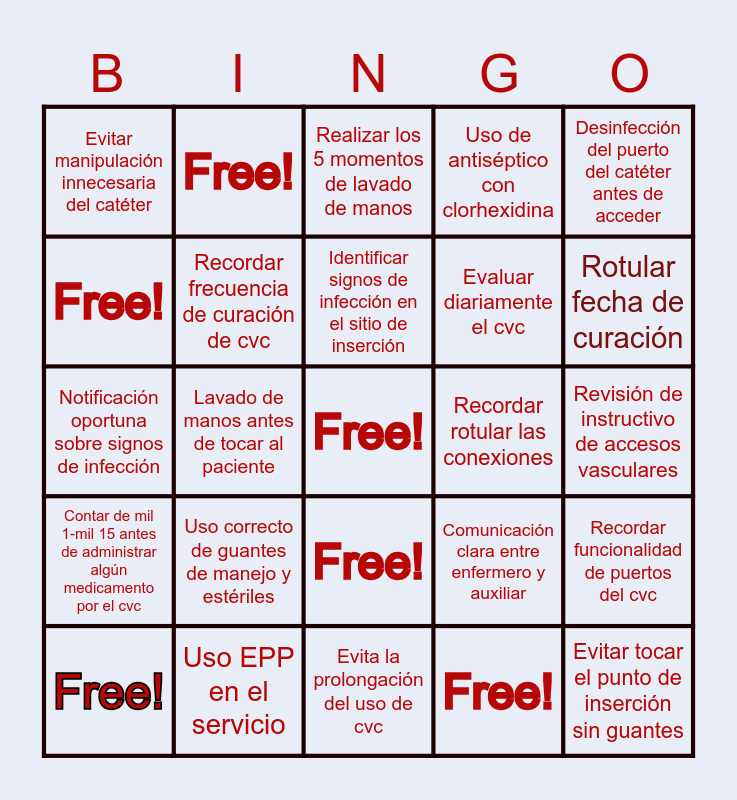 This bingo card has a free space and 24 words: Free!, Uso correcto de guantes de manejo y estériles, Identificar signos de infección en el sitio de inserción, Free!, Desinfección del puerto del catéter antes de acceder, Evitar manipulación innecesaria del catéter, Free!, Realizar los 5 momentos de lavado de manos, Recordar rotular las conexiones, Revisión de instructivo de accesos vasculares, Notificación oportuna sobre signos de infección, Recordar frecuencia de curación de cvc, Comunicación clara entre enfermero y auxiliar, Recordar funcionalidad de puertos del cvc, Free!, Uso EPP en el servicio, Evita la prolongación del uso de cvc, Uso de antiséptico con clorhexidina, Rotular fecha de curación, Contar de mil 1-mil 15 antes de administrar algún medicamento por el cvc, Lavado de manos antes de tocar al paciente, Free!, Evaluar diariamente el cvc and Evitar tocar el punto de inserción sin guantes.