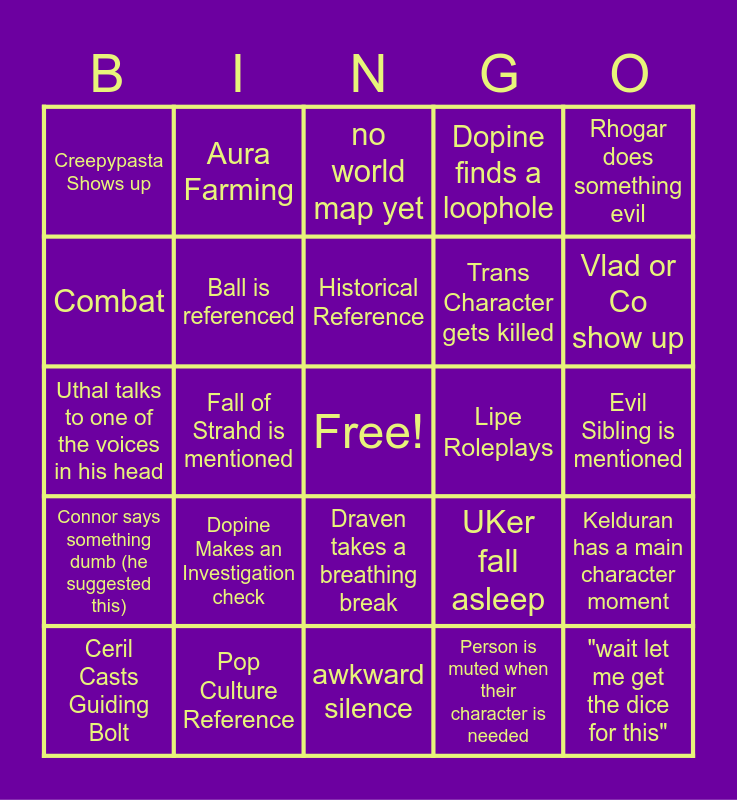 This bingo card has a free space and 24 words: Dopine Makes an Investigation check, Pop Culture Reference, Historical Reference, Ceril Casts Guiding Bolt, Rhogar does something evil, Creepypasta Shows up, Combat, Aura Farming, Lipe Roleplays, Draven takes a breathing break, Trans Character gets killed, Uthal talks to one of the voices in his head, UKer fall asleep, Kelduran has a main character moment, Ball is referenced, Person is muted when their character is needed, Evil Sibling is mentioned, no world map yet, Vlad or Co show up, Fall of Strahd is mentioned, "wait let me get the dice for this", Connor says something dumb (he suggested this), Dopine finds a loophole and awkward silence.