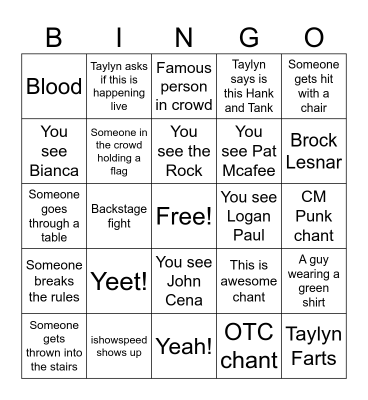 This bingo card has a free space and 24 words: Yeet!, ishowspeed shows up, You see the Rock, Someone gets thrown into the stairs, Someone gets hit with a chair, Blood, You see Bianca, Taylyn asks if this is happening live, You see Logan Paul, You see John Cena, You see Pat Mcafee, Someone goes through a table, This is awesome chant, A guy wearing a green shirt, Someone in the crowd holding a flag, OTC chant, CM Punk chant, Famous person in crowd, Brock Lesnar, Backstage fight, Taylyn Farts, Someone breaks the rules, Taylyn says is this Hank and Tank and Yeah!.
