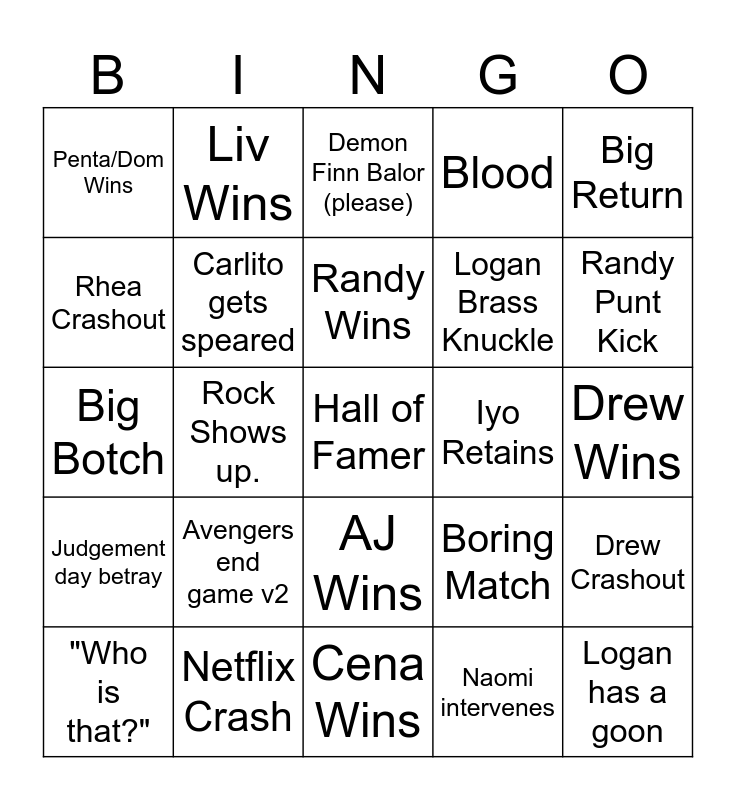 This bingo card has a free space and 24 words: Avengers end game v2, Netflix Crash, Randy Wins, "Who is that?", Big Return, Penta/Dom Wins, Rhea Crashout, Liv Wins, Iyo Retains, AJ Wins, Logan Brass Knuckle, Big Botch, Boring Match, Drew Crashout, Carlito gets speared, Naomi intervenes, Drew Wins, Demon Finn Balor (please), Randy Punt Kick, Rock Shows up., Logan has a goon, Judgement day betray, Blood and Cena Wins.