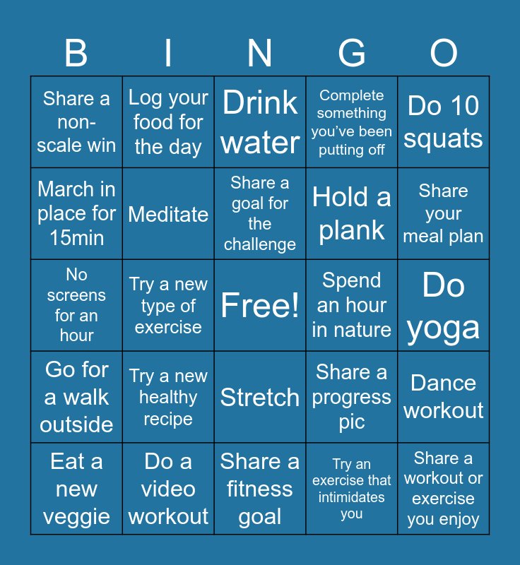 This bingo card has a free space and 29 words: Eat a new veggie, Share a photo of a meal, Try a new type of exercise, Walk 3,000 steps, Share a non-scale win, Drink water, Meditate, Try a new healthy recipe, Spend an hour in nature, Do a video workout, Do yoga, Share a workout or exercise you enjoy, Share a fitness goal, Try an exercise that intimidates you, Share your meal plan, Challenge someone to a step off, Stretch, Go for a walk outside, Do 10 squats, No screens for an hour, Share a progress pic, Share one thing that keeps you on track, Hold a plank, March in place for 15min, Complete something you’ve been putting off, Log your food for the day, Dance workout, Share a goal for the challenge and Go for a bike ride, swim, or run.