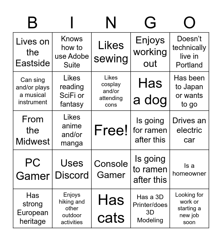 This bingo card has a free space and 24 words: Uses Discord, Enjoys hiking and other outdoor activities, Likes cosplay and/or attending cons, Has strong European heritage, Doesn’t technically live in Portland, Lives on the Eastside, Can sing and/or plays a musical instrument, Knows how to use Adobe Suite, Is going for ramen after this, Console Gamer, Has a dog, From the Midwest, Is going to ramen after this, Is a homeowner, Likes reading SciFi or fantasy, Has a 3D Printer/does 3D Modeling, Drives an electric car, Likes sewing, Has been to Japan or wants to go, Likes anime and/or manga, Looking for work or starting a new job soon, PC Gamer, Enjoys working out and Has cats.