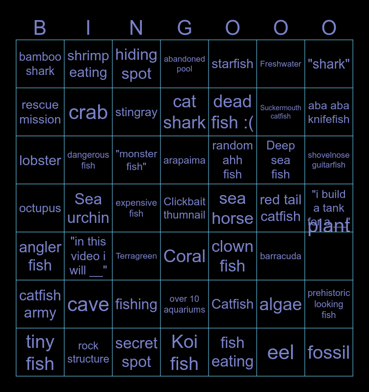 This bingo card has a free space and 48 words: Catfish, Suckermouth catfish, Koi fish, Sea urchin, "monster fish", "i build a tank for a __", shrimp eating, rock structure, Freshwater, Coral, "shark", abandoned pool, Deep sea fish, random ahh fish, catfish army, red tail catfish, rescue mission, aba aba knifefish, algae, starfish, dead fish :(, expensive fish, bamboo shark, crab, prehistoric looking fish, stingray, shovelnose guitarfish, tiny fish, arapaima, dangerous fish, eel, sea horse, plant, cave, octupus, clown fish, barracuda, lobster, Terragreen, fishing, angler fish, fossil, hiding spot, secret spot, cat shark, over 10 aquariums, "in this video i will __" and fish eating.