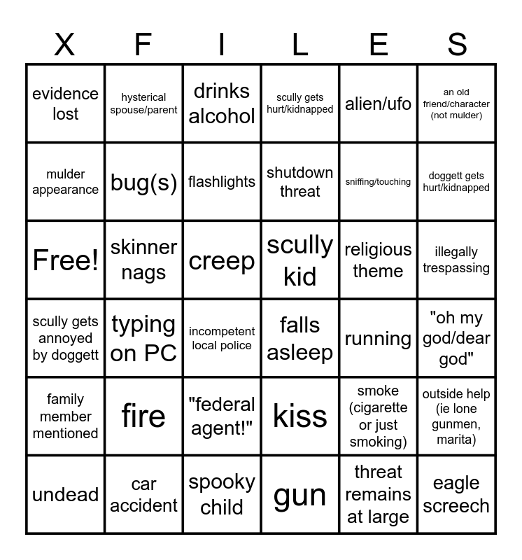 This bingo card has 36 words: kiss, "federal agent!", gun, mulder appearance, scully gets annoyed by doggett, scully kid, bug(s), spooky child, alien/ufo, smoke (cigarette or just smoking), doggett gets hurt/kidnapped, scully gets hurt/kidnapped, outside help (ie lone gunmen, marita), skinner nags, shutdown threat, evidence lost, family member mentioned, religious theme, Free!, drinks alcohol, creep, typing on PC, falls asleep, incompetent local police, running, hysterical spouse/parent, sniffing/touching, car accident, flashlights, an old friend/character (not mulder), eagle screech, undead, "oh my god/dear god", illegally trespassing, fire and threat remains at large.