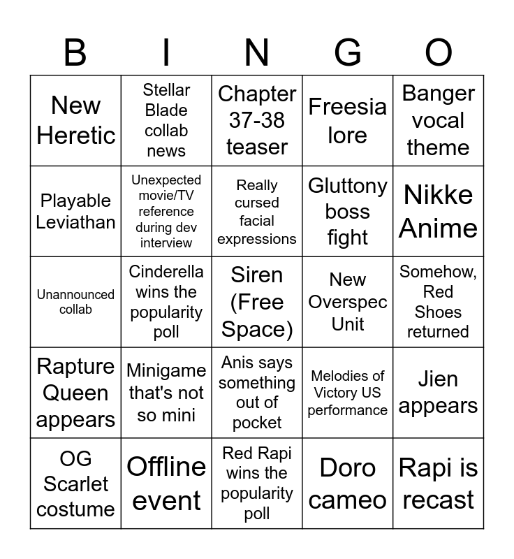 This bingo card has a free space and 24 words: Minigame that's not so mini, Offline event, Really cursed facial expressions, OG Scarlet costume, Banger vocal theme, New Heretic, Playable Leviathan, Stellar Blade collab news, New Overspec Unit, Anis says something out of pocket, Gluttony boss fight, Unannounced collab, Melodies of Victory US performance, Jien appears, Unexpected movie/TV reference during dev interview, Doro cameo, Somehow, Red Shoes returned, Chapter 37-38 teaser, Nikke Anime, Cinderella wins the popularity poll, Rapi is recast, Rapture Queen appears, Freesia lore and Red Rapi wins the popularity poll.