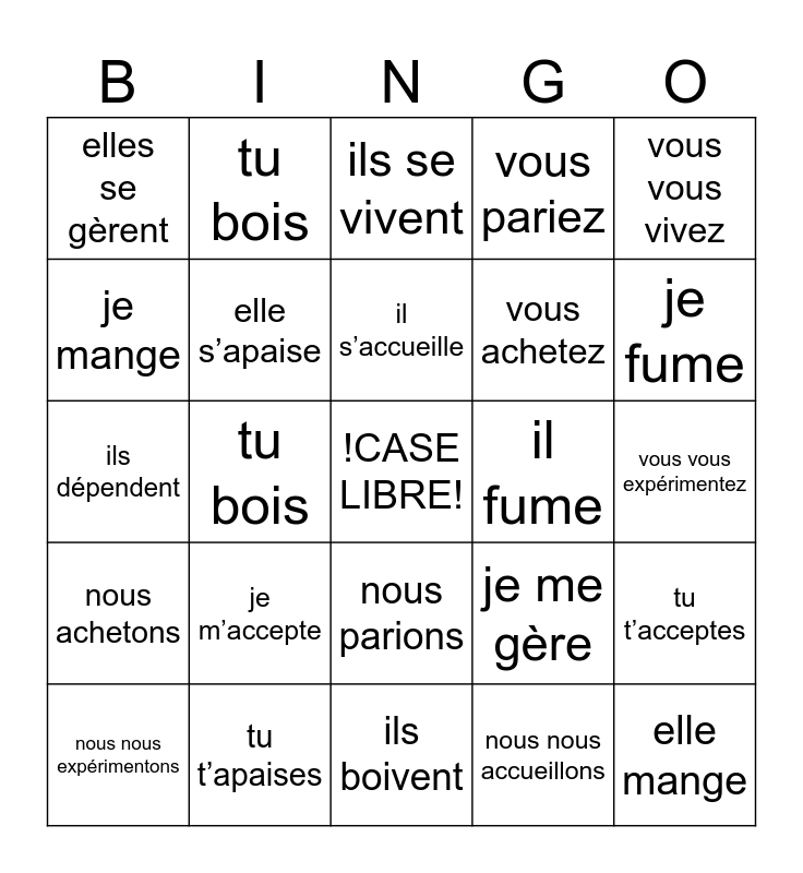 This bingo card has a free space and 24 words: je m’accepte, tu t’apaises, il s’accueille, nous nous expérimentons, vous vous vivez, elles se gèrent, je mange, tu bois, il fume, nous parions, vous achetez, ils dépendent, je me gère, tu t’acceptes, elle s’apaise, nous nous accueillons, vous vous expérimentez, ils se vivent, je fume, tu bois, elle mange, nous achetons, vous pariez and ils boivent.
