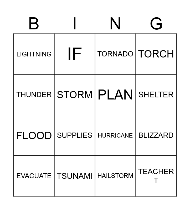 This bingo card has 16 words: TSUNAMI, BLIZZARD, TORNADO, LIGHTNING, FLOOD, IF, HURRICANE, HAILSTORM, THUNDER, STORM, EVACUATE, TORCH, SUPPLIES, SHELTER, PLAN and TEACHER T.