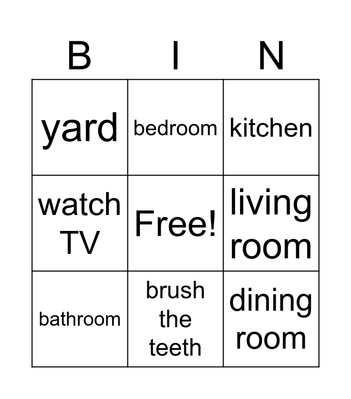 This bingo card has a free space and 8 words: living room, kitchen, bedroom, bathroom, yard, dining room, watch TV and brush the teeth.