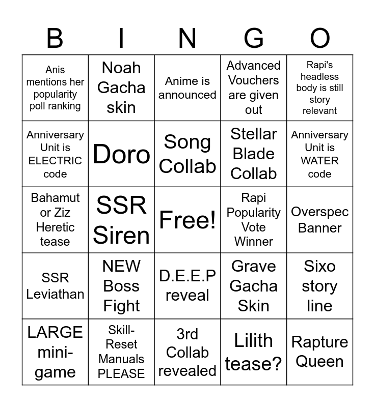 This bingo card has a free space and 29 words: LARGE mini-game, Banger OST tease, SSR Siren, Tearful Trailer, Anis mentions her popularity poll ranking, Anime is announced, Doro, NEW Boss Fight, Rapi Popularity Vote Winner, Skill-Reset Manuals PLEASE, Overspec Banner, Rapture Queen, 3rd Collab revealed, Lilith tease?, Anniversary Unit is WATER code, Cinderella Popularity Vote Winner, D.E.E.P reveal, SSR Leviathan, Rapi's headless body is still story relevant, Bahamut or Ziz Heretic tease, Grave Gacha Skin, NIKKE Staff went on a submarine adventure, Stellar Blade Collab, Anniversary Unit is ELECTRIC code, Advanced Vouchers are given out, Noah Gacha skin, Sixo story line, Song Collab and Yuni is the free anniversary unit.
