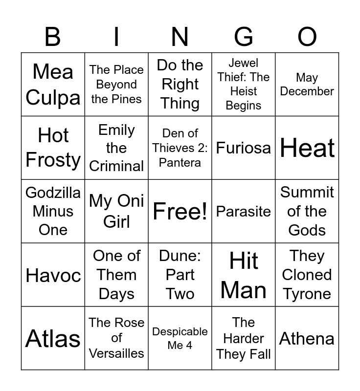 This bingo card has a free space and 25 words: One of Them Days, Despicable Me 4, Den of Thieves 2: Pantera, Atlas, May December, Mea Culpa, Hot Frosty, The Place Beyond the Pines, Parasite, Dune: Part Two, Furiosa, Godzilla Minus One, Hit Man, They Cloned Tyrone, Emily the Criminal, Grave of the Fireflies, Summit of the Gods, Do the Right Thing, Heat, My Oni Girl, Athena, The Rose of Versailles, Havoc, Jewel Thief: The Heist Begins and The Harder They Fall.