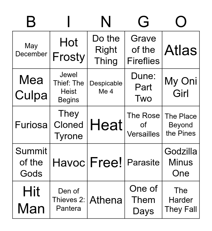 This bingo card has 26 words: Free!, One of Them Days, Despicable Me 4, Den of Thieves 2: Pantera, Atlas, May December, Mea Culpa, Hot Frosty, The Place Beyond the Pines, Parasite, Dune: Part Two, Furiosa, Godzilla Minus One, Hit Man, They Cloned Tyrone, Emily the Criminal, Grave of the Fireflies, Summit of the Gods, Do the Right Thing, Heat, My Oni Girl, Athena, The Rose of Versailles, Havoc, Jewel Thief: The Heist Begins and The Harder They Fall.