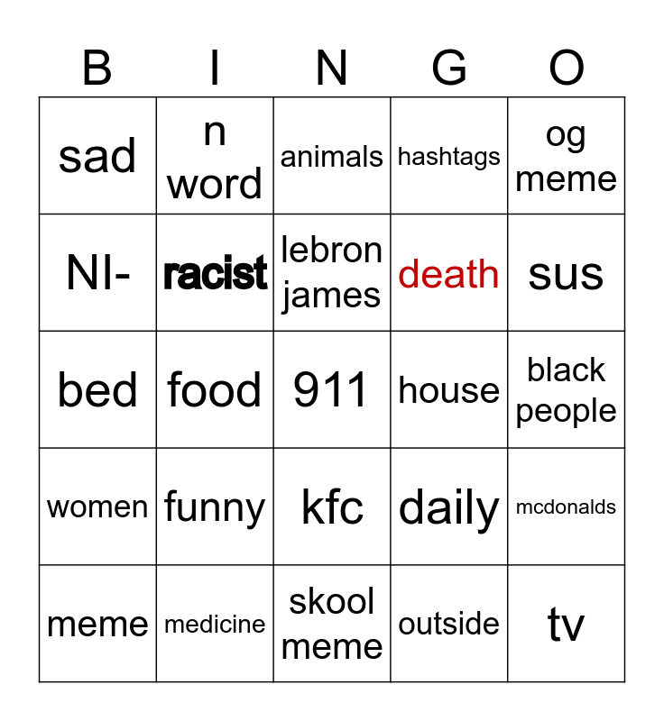 This bingo card has a free space and 24 words: funny, medicine, lebron james, meme, og meme, sad, NI-, n word, house, kfc, death, bed, daily, mcdonalds, racist, outside, black people, animals, sus, food, tv, women, hashtags and skool meme.