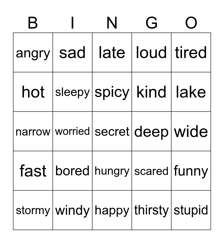 This bingo card has a free space and 24 words: bored, windy, spicy, stormy, tired, angry, hot, sad, deep, hungry, kind, narrow, scared, funny, sleepy, thirsty, wide, late, lake, worried, stupid, fast, loud and happy.