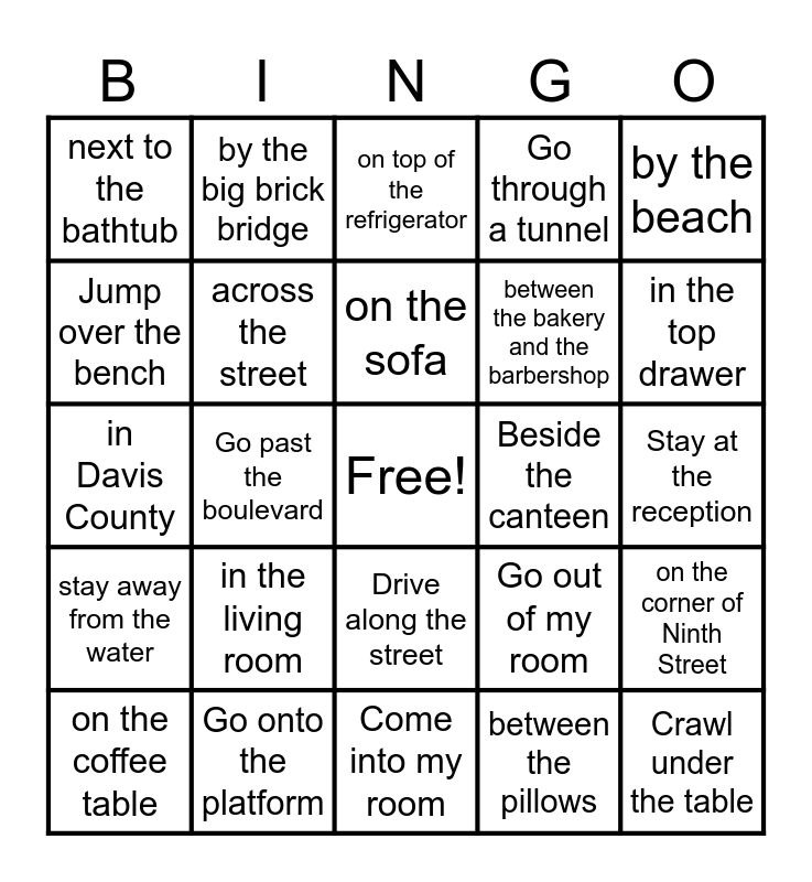 This bingo card has a free space and 25 words: on the coffee table, in the living room, on the sofa, between the pillows, in the top drawer, next to the bathtub, by the big brick bridge, on top of the refrigerator, between the bakery and the barbershop, on the corner of Ninth Street, in Davis County, across the street, Go out of my room, Crawl under the table, Jump over the bench, Go onto the platform, Come into my room, Go through a tunnel, Stay at the reception, stay away from the water, Go past the boulevard, Drive along the street, Beside the canteen, by the beach and At the back of the library.
