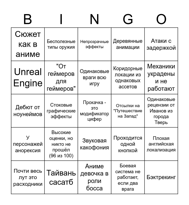 This bingo card has 25 words: Высокие оценки, но никто не прошёл (96 из 100), Аниме девочка в роли босса, Одинаковые враги всю игру, Почти весь лут это расходники, Атаки с задержкой, Сюжет как в аниме, Unreal Engine, Бесполезные типы оружия, Отсылки на "Путешествие на Запад", Звуковая какофония, Коридорные локации из однаковых ассетов, Дебют от ноунеймов, Проходится одной кнопкой, Плохая английская локализация, "От геймеров для геймеров", Бэктрекинг, Одинаковые рецензии от Иванов из города Тверь, Непрозрачные эффекты, Механики украдены и не работают, Стоковые графические эффекты, Прокачка - это модификатор цифер, Тайвань сасатб, У персонажей анорексия, Деревянные анимации and Боевая система не работает, если два врага.