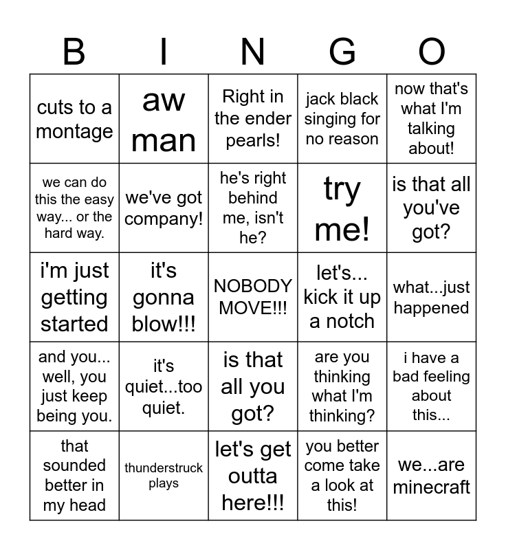 This bingo card has 25 words: it's quiet...too quiet., let's get outta here!!!, he's right behind me, isn't he?, that sounded better in my head, now that's what I'm talking about!, cuts to a montage, we can do this the easy way... or the hard way., aw man, let's... kick it up a notch, is that all you got?, try me!, i'm just getting started, are you thinking what I'm thinking?, i have a bad feeling about this..., we've got company!, we...are minecraft, what...just happened, Right in the ender pearls!, is that all you've got?, it's gonna blow!!!, NOBODY MOVE!!!, thunderstruck plays, and you... well, you just keep being you., jack black singing for no reason and you better come take a look at this!.